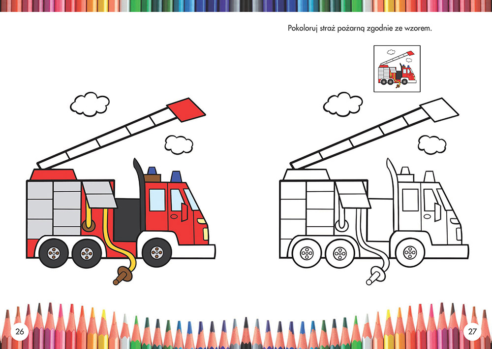 Do ka¿dego rysunku dodany jest kolorowy wzór do na¶ladowania oraz naklejka – wszystko to gwarantuje dzieciom doskona³± zabawê przez d³ugi czas. Ilustracje s± ciekawe i jednocze¶nie proste do pomalowania, dlatego z pewno¶ci± poradz± sobie nawet najmniejsze dzieci, które dopiero zaczynaj± kolorowaæ.