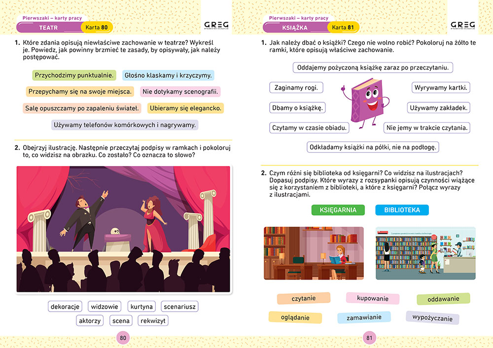 Wszystko to w kolorowej, przyjaznej dla oka ma³ego ucznia formie graficznej, w postaci atrakcyjnych, ciekawych zadañ rozwijaj±cych zarówno zasób wiedzy, jak umiejêtno¶ci manualne, wyobra¼niê i kreatywno¶æ. Karty posiadaj± perforacjê, dziêki czemu ³atwo jest je wyrwaæ, a kolorystyka dobrana jest tak, by po skserowaniu na czarno-bia³ej kopiarce strony zachowa³y czytelno¶æ.