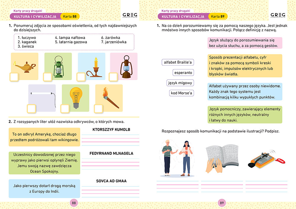 Æwiczenia doskonal± umiejêtno¶æ pisania, zapoznaj± te¿ z takimi formami, jak list, zaproszenie, og³oszenie, opowiadanie. Zadbali¶my o kolorow±, atrakcyjn± dla ma³ego ucznia oprawê graficzn±, zadania s± ciekawe i nie tylko buduj± zasób wiedzy, ale te¿ rozwijaj± umiejêtno¶ci manualne, wyobra¼niê i kreatywno¶æ. Dziêki perforacji ³atwo wyrwaæ ka¿d± kartkê z ksi±¿ki, a specjalnie dobrana kolorystyka zapewnia zachowanie czytelno¶ci w przypadku kserowania na czarno-bia³ej kopiarce.