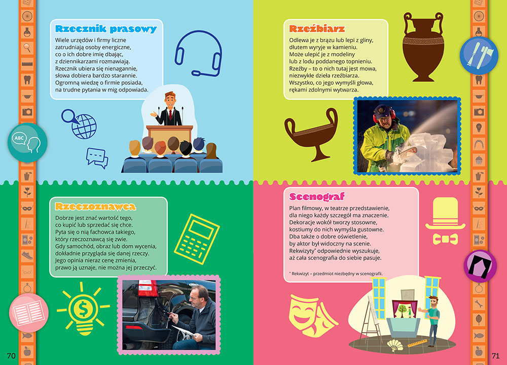 Są tutaj zarówno takie profesje, z jakimi maluchy stykają się na co dzień (fryzjer, lekarz, nauczyciel), jak zawody spotykane, ale trudne do wyjaśnienia dziecku (radca prawny, urbanista, windykator), a także wiersze o zawodach nietypowych, ciekawych, interesujących (poławiacz pereł, zoopsycholog, dżokej). Wierszykom towarzyszą kolorowe rysunki lub zdjęcia, a całość jest utrzymana w przyjemnej dla oka kolorystyce, estetyczna i wesoła, dzięki czemu dzieci nie będą mogły oderwać się od tej książki. Kto wie, może znajdą w niej inspirację, jaki zawód chcą wykonywać w przyszłości?