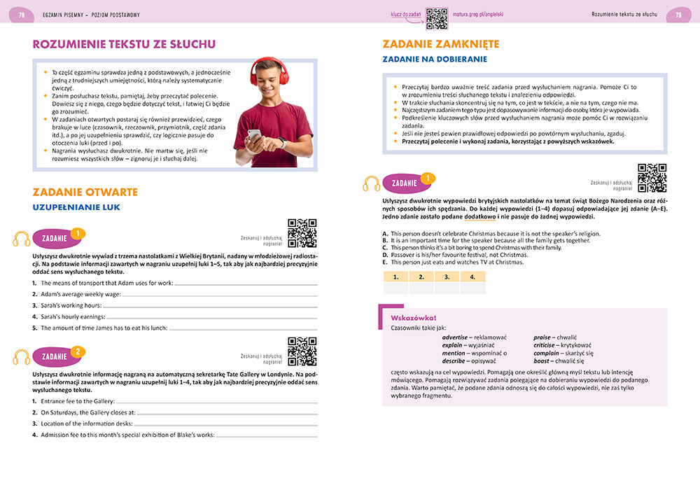 Co jako rodzice, nauczyciele, przyjaciele mo¿emy poleciæ naszym maturzystom? Otó¿, niedawno Wydawnictwo GREG, pod redakcj± pani Agnieszki Antosiewicz, autorstwa Danieli Maclsaac i Bogus³awa Soleckiego wyda³o rewelacyjnie przygotowan± pomoc „Matura. Jêzyk angielski. Poziom podstawowy i rozszerzony” – podrêcznik, skierowany do uczniów klas maturalnych, ale moim zdaniem i nie tylko. Mo¿e on byæ tak¿e wykorzystany przez osoby, które chc± pog³êbiæ, sprawdziæ i utrwaliæ swoj± wiedzê (...) Uczeñ dostaje do rêki bardzo rzetelnie przygotowany materia³. Ponad trzysta stron zadañ, tekstów, komentarzy. I co jest bardzo wa¿ne i nale¿y to wyra¼nie podkre¶liæ, podrêcznik jest przygotowany do matury w 2023 roku, w której zajd± pewne zmiany (...) To co wyró¿nia podrêcznik „Matura. Jêzyk angielski. Poziom podstawowy i rozszerzony” wydawnictwa GREG od innych - mo¿e podobnych, na rynku, to to ¿e na ka¿dej stronie znajdziemy klucz odpowiedzi do zadañ. Bez problemu otworzymy go za pomoc± klucza QR. Dziesi±tki zadañ – ró¿nego typu, mnóstwo tekstów, ciekawych pomocnych zdjêæ, ilustracji, jasny, przejrzysty tekst. Ca³o¶æ przemy¶lana i bardzo dobrze przygotowana – oto moim zdaniem najlepsza pomoc dla ka¿dego maturzysty, zdaj±cego egzamin z jêzyka angielskiego.