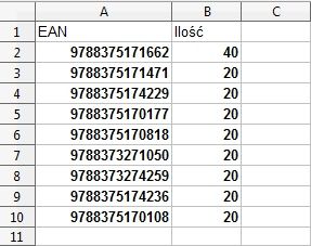 • Wymagane kolumny to: kod EAN lub ISBN lub kod Wydawnictwa GREG oraz liczba zamawianych sztuk (zgodna z ilością w paczce). Mogą występować inne kolumny ale są one zbędne.