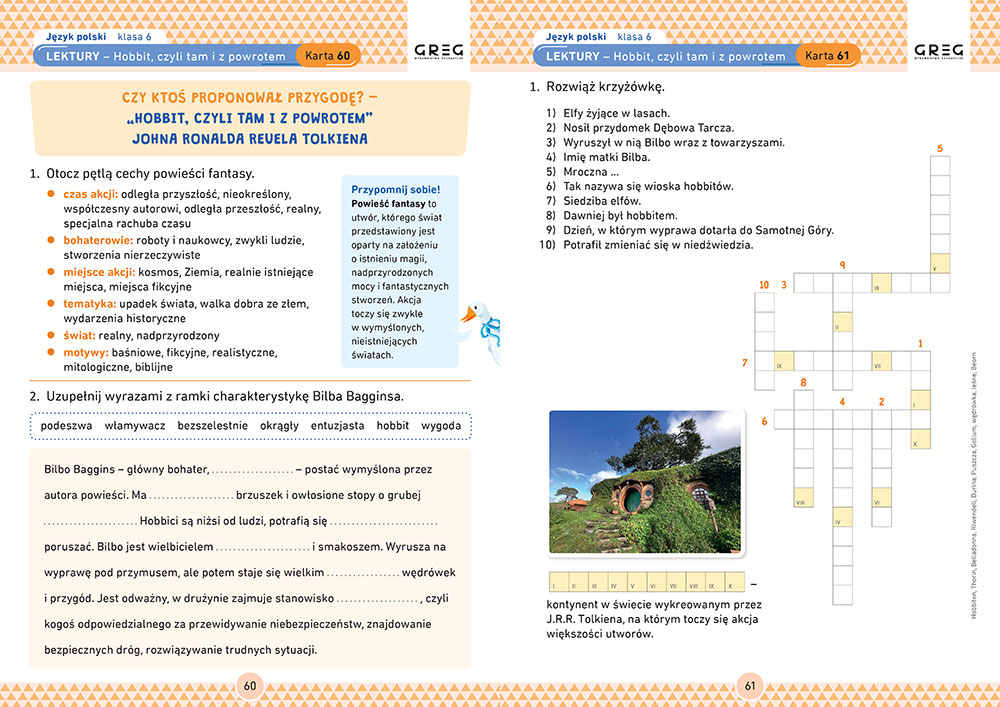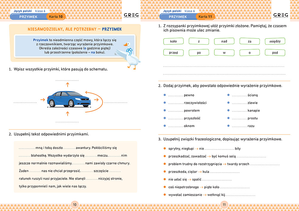 Dodatkowo Wydawnictwo Greg zadba³o, aby nasze dzieci mia³y weso³e towarzystwo w nauce. O czym mowa? O g±sce, która towarzyszy nam na kartach pracy. Nie mo¿na jednak zapomnieæ, ¿e ksi±¿ka ta ma za zadanie utrwaliæ wiedzê lub pomóc w jej zdobyciu, dlatego zaznaczê, ¿e karty pracy obejmuj± zakres wiedzy z gramatyki, poznamy czê¶ci zdania i mowy. Zakres æwiczeñ dotyczy równie¿ obowi±zkowych lektur i wierszy z klasy szóstej. Ciekawie przygotowane zadania i æwiczenia z pewno¶ci± nie bêd± tylko nudn± prac±, która trzeba wykonaæ. Mog± byæ dobr± zabaw± i wype³nieniem czasu wolnego nie tylko w domu, czy na ¶wietlicy szkolnej, ale tak¿e chocia¿by w poczekalni, czy podró¿uj±c samochodem.