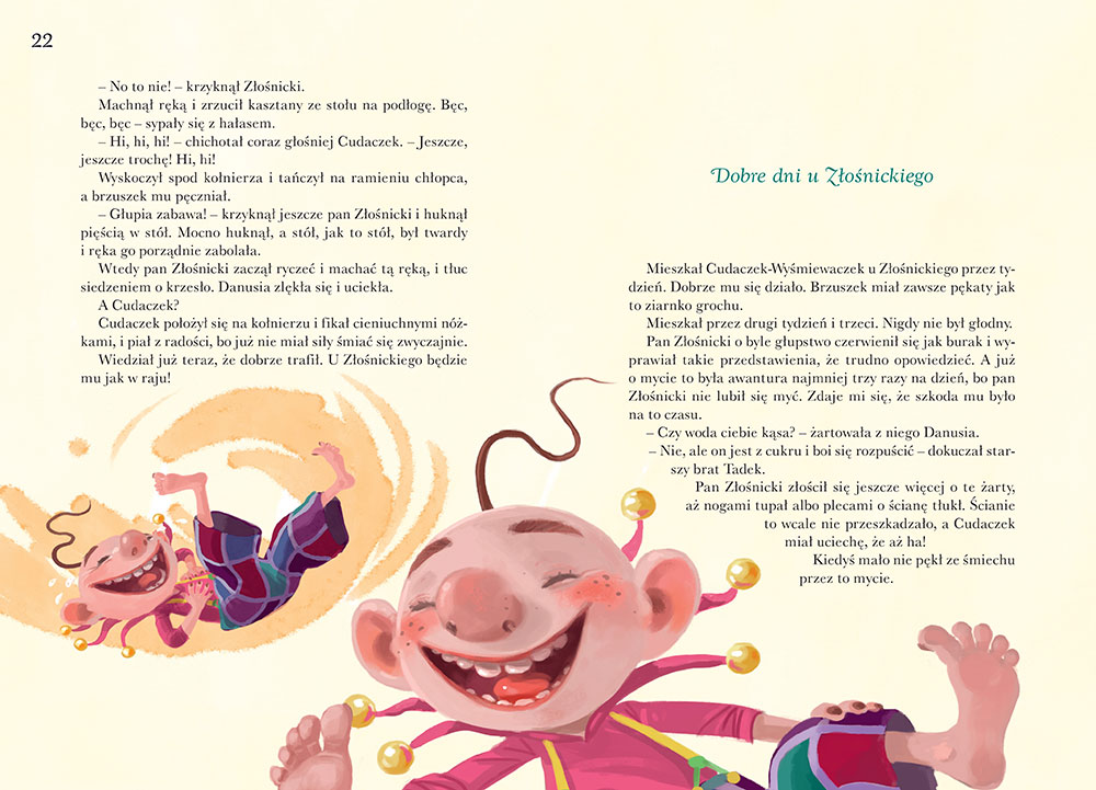 To licho malusie śmieje się z dzieci, które brzydko się zachowują, a brzuszek mu wtedy pęcznieje. Cudaczek chodzi po świecie i szuka dzieci, z których mógłby się wyśmiewać. Czy można się pozbyć tego wrednego stworka? Nie jest to łatwe, ale wystarczy trochę wytrwałości i na pewno się uda! Sprawdźcie, czy dzieci sobie z tym poradziły.