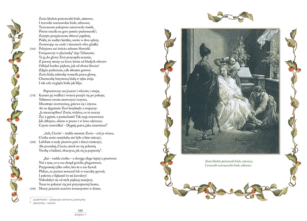 Książka od razu zwróciła na siebie moją uwagę, kiedy razem z mamą weszłam do księgarni. Twarda, barwna okładka i "bogate wnętrze" sprawiają, że całość prezentuje się okazale, a wzrok sam wędruje w kierunku książki. (...) Treść wzbogacono także o ilustracje Michała Elwiro Andriollego (artysty i rysownika, a także przyjaciela najstarszego syna Mickiewicza) z 1882 roku. Artysta w bardzo dobry sposób zinterpretował, a następnie zobrazował, treść utworu Adama Mickiewicza. Jego prace nie tylko oddają ducha epoki, ale również prezentują czar Soplicowskiego dworku, a także niezapomnianych bohaterów. Widać, że autor tych dzieł poważnie potraktował poemat i podszedł do zadania z pełną powagą oraz należytym szacunkiem (...)