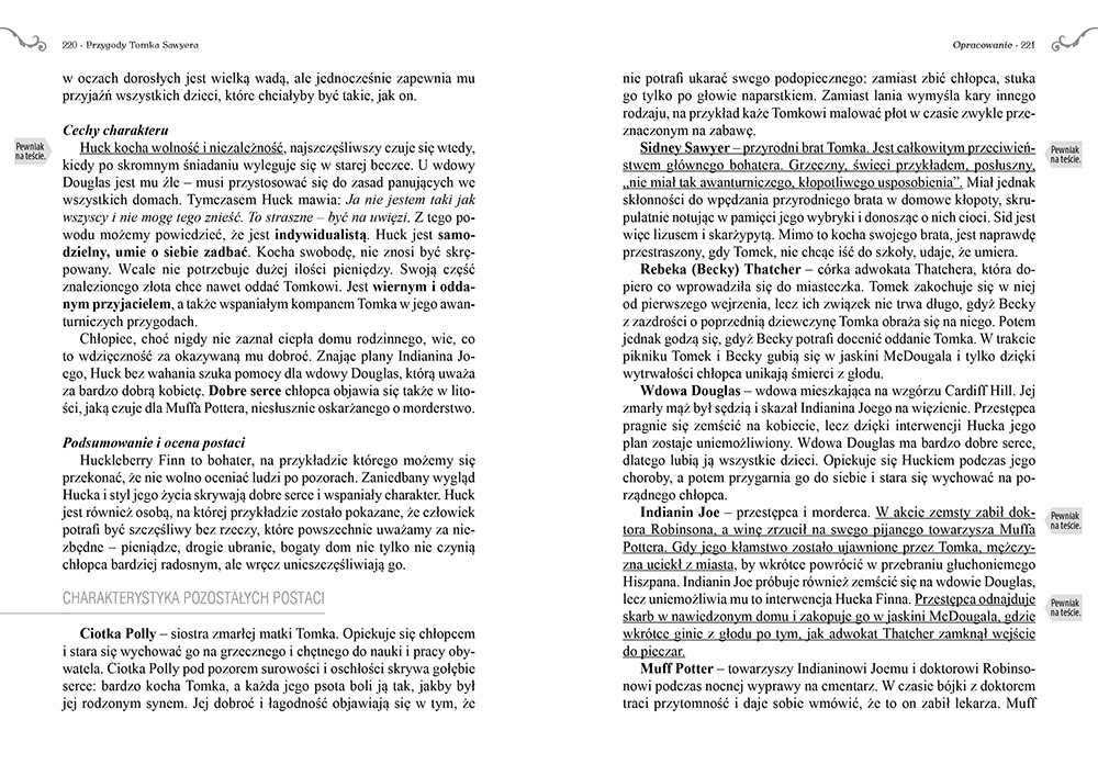 Wydanie Przygód Tomka Sawyera kompletne bez skrótów i cięć w treści. W tym wydaniu znajdziesz odpowiedzi na pytania z podręcznika - „pewniak na teście”, czyli wskazanie zagadnień, które zwykle pojawiają się w pytaniach z danej lektury we wszelkich testach sprawdzających wiedzę, a także w podręcznikach i na klasówkach. Książka zawiera pełen tekst lektury. Na końcu książki zamieszczono opracowanie, w którym znajduje się bardzo szczegółowe streszczenie oraz drugie skrócone, ułatwiające szybkie przygotowanie się przed lekcją. Opracowanie zawiera ponadto plan wydarzeń, wnikliwie wyjaśnioną problematykę oraz szerokie charakterystyki bohaterów.