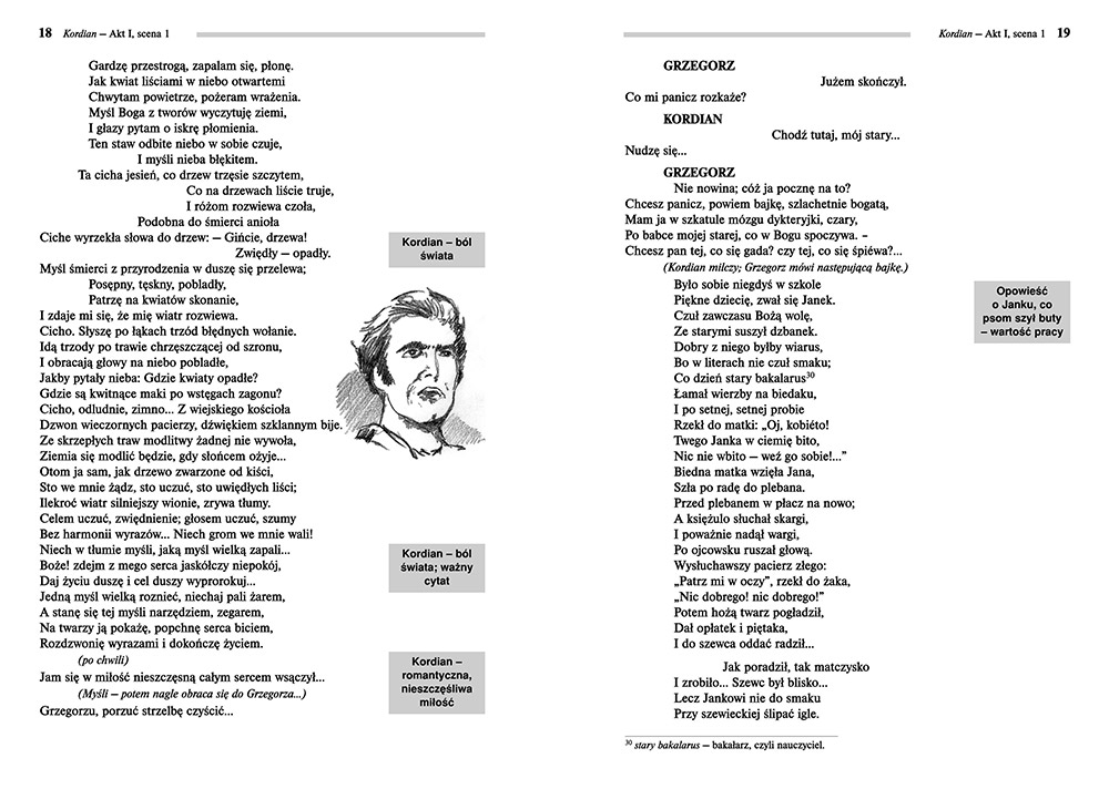 Wydanie Kordiana kompletne bez skrótów i ciêæ w tre¶ci. W tym wydaniu znajdziesz odpowiedzi na pytania z podrêcznika - „pewniak na te¶cie”, czyli wskazanie zagadnieñ, które zwykle pojawiaj± siê w pytaniach z danej lektury we wszelkich testach sprawdzaj±cych wiedzê, a tak¿e w podrêcznikach i na klasówkach. Ksi±¿ka zawiera pe³en tekst lektury. Na koñcu ksi±¿ki zamieszczono opracowanie, w którym znajduje siê bardzo szczegó³owe streszczenie oraz drugie skrócone, u³atwiaj±ce szybkie przygotowanie siê przed lekcj±. Opracowanie zawiera ponadto plan wydarzeñ, wnikliwie wyja¶nion± problematykê oraz szerokie charakterystyki bohaterów.