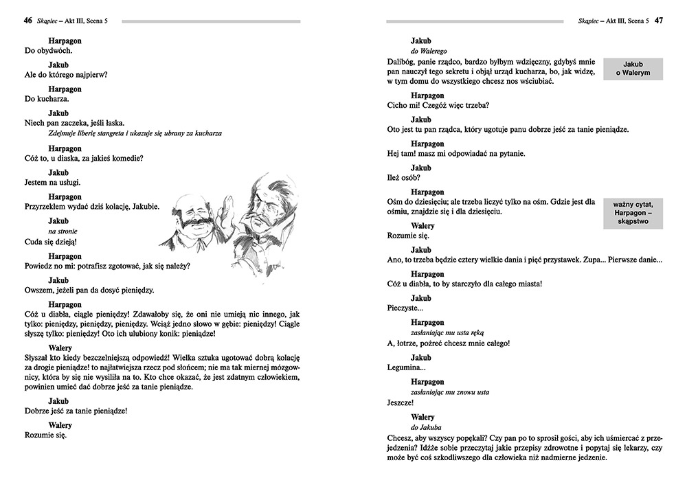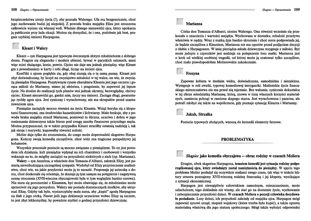 Wydanie Skąpca kompletne bez skrótów i cięć w treści. W tym wydaniu znajdziesz odpowiedzi na pytania z podręcznika - „pewniak na teście”, czyli wskazanie zagadnień, które zwykle pojawiają się w pytaniach z danej lektury we wszelkich testach sprawdzających wiedzę, a także w podręcznikach i na klasówkach. Książka zawiera pełen tekst lektury. Na końcu książki zamieszczono opracowanie, w którym znajduje się bardzo szczegółowe streszczenie oraz drugie skrócone, ułatwiające szybkie przygotowanie się przed lekcją. Opracowanie zawiera ponadto plan wydarzeń, wnikliwie wyjaśnioną problematykę oraz szerokie charakterystyki bohaterów.