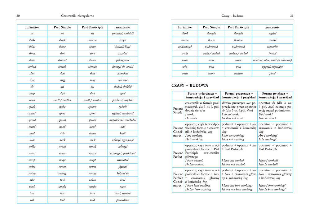 Tablicach... można znaleźć zarówno wyczerpujące tematyczne słowniczki, jak i tabele przejrzyście wyjaśniające zasady stosowania różnych czasów i konstrukcji gramatycznych. Cała niezbędna wiedza została zebrana w jednym miejscu - polecamy!